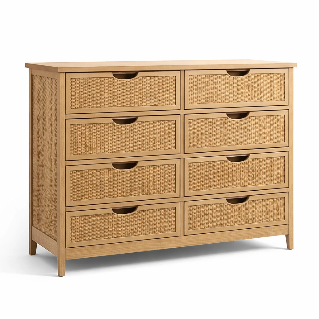 Cajonera de madera de roble y ratán trenzado con 8 cajones natural