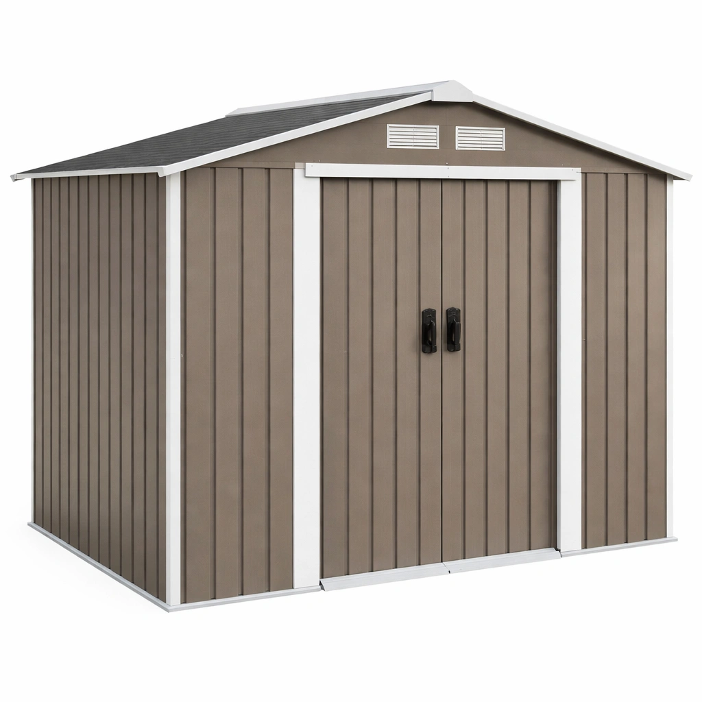 Este cobertizo para jardín está construido con una estructura de acero galvanizado y revestido con pintura resistente a la corrosión. Sus dimensiones son 213 cm de largo, 130 cm de ancho y 185 cm de alto. El color principal es marrón, complementado con detalles en blanco. Cuenta con una puerta corredera doble y ventilación incorporada. El peso neto del cobertizo es de 60 kg, y es resistente al agua y ofrece protección contra rayos UV.